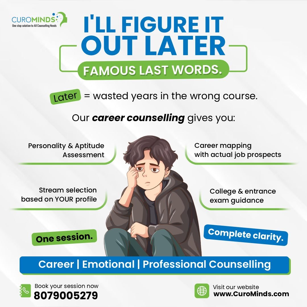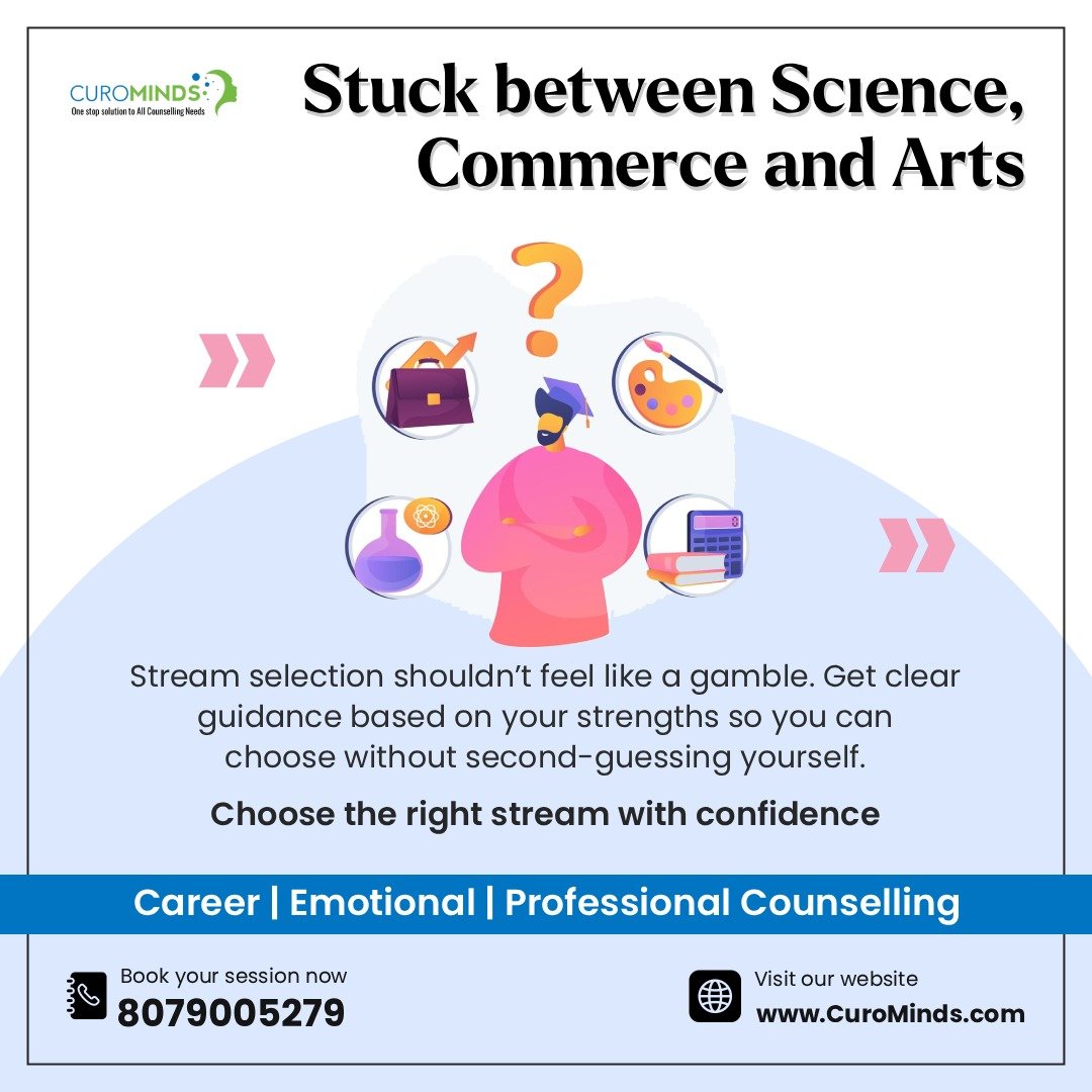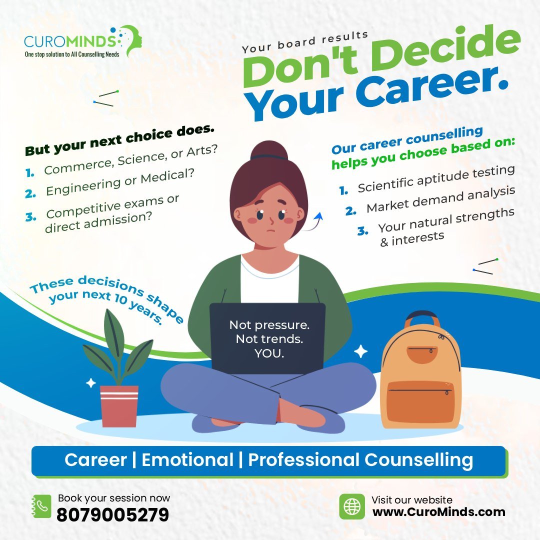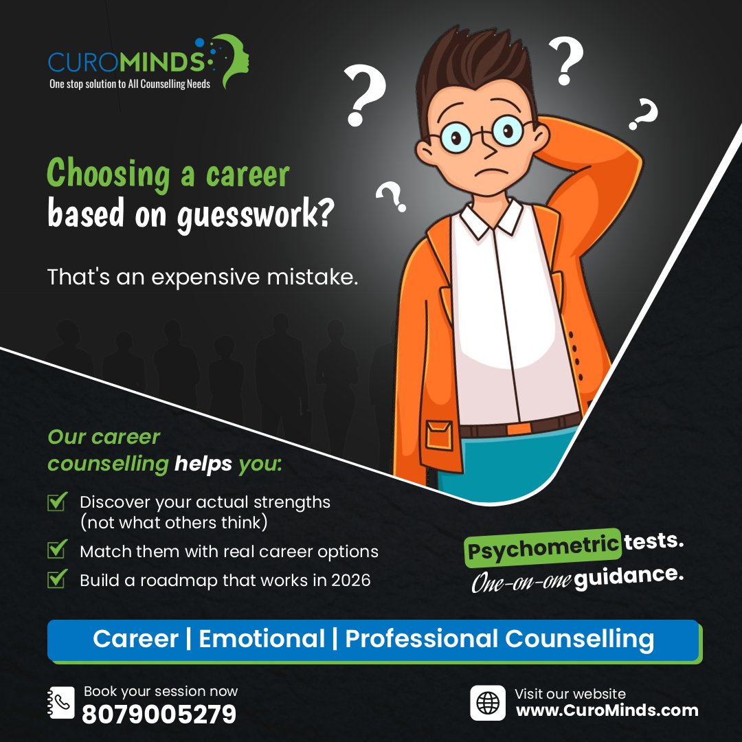 Choosing the right career is tough—pressure from parents, teachers, and society can leave students feeling lost. That’s where CuroMinds steps in. Using a proven Multi-Dimensional Psychometric Analysis, we help students and professionals discover their strengths, interests, and ideal career paths. Whether you’re a student unsure about subject choices, a graduate struggling with next steps, or a professional considering a switch, we provide the clarity you need. From setting goals to mapping out your future, CuroMinds guides you toward the right career—one that truly fits you.