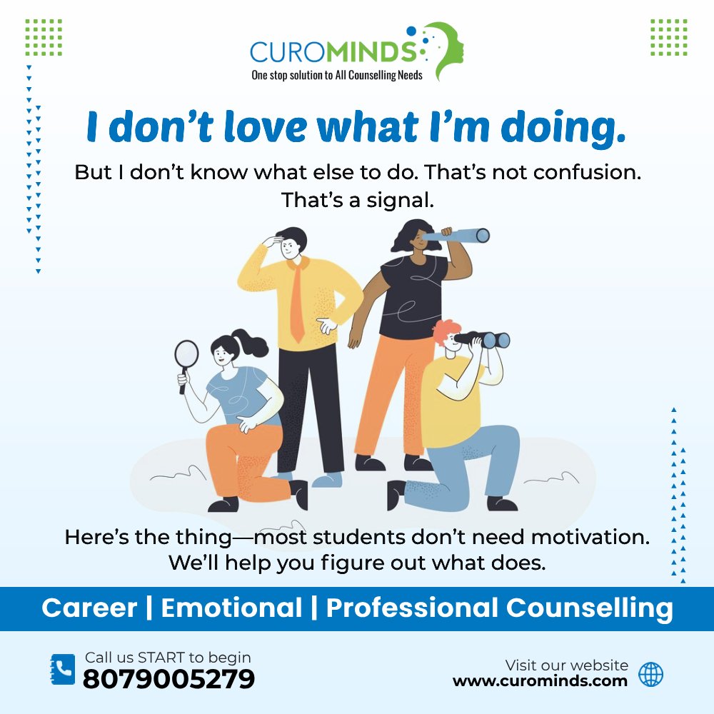 CuroMinds helps professionals tackle work-life balance and career growth with expert counseling and psychometric tools. Struggling with low motivation or job dissatisfaction? We identify career paths, reignite passion, or explore new opportunities. Our guidance eases job stress, boosts productivity, and improves time management. From workplace conflicts to performance pressure, we provide solutions that keep you thriving—both mentally and physically.